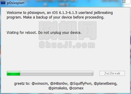 3、耐心等待,期間設備會重啟一次,請注意越獄過程中不要操作設備或者插拔數據線。
