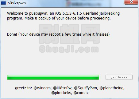 5、最後越獄完成,工具出現如下提示,此時設備會自動重啟,然後就能看到新增的cydia。