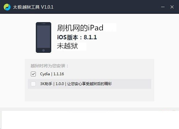1:打開太極越獄工具,附帶的助手工具可自行勾選。
