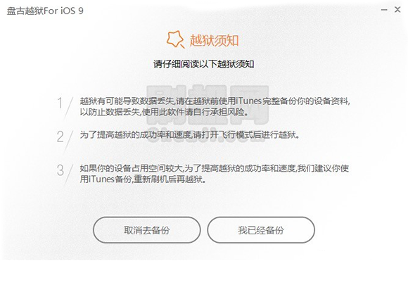 4、請仔細閱讀【越獄須知】後,點擊【我已經備份】進入下一步。