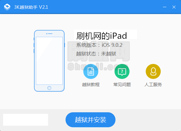 2、檢測設備版本,是否可以越獄,符合越獄要求後,可以點擊“越獄並安裝”按鍵開始越獄。