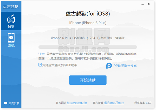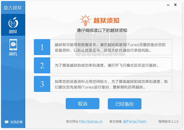 3.越獄有可能導致數據丟失,請在越獄前使用iTunes完整的備份您的設備資料,以防止數據丟失,使用本次軟件請自行承擔風險。