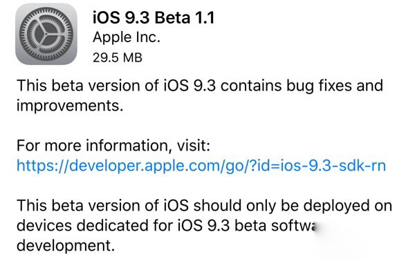 雖然有不少用戶體驗後稱iOS9.3 beta1存在發熱、掉電快等問題,不過,與iOS9.3 beta1安裝失敗,及安裝過程中卡在蘋果Logo界面不動的情況相比,後者相當緊急。為此蘋果在今天凌晨再次向開發者推送了iOS9.3 Beta1.1升級補丁,緊急修復了升級安裝問題