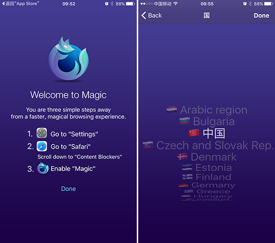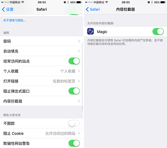 下載到這款App後,第一次打開會提示你進入設置-Safari-內容攔截器中啟動“Magic”。