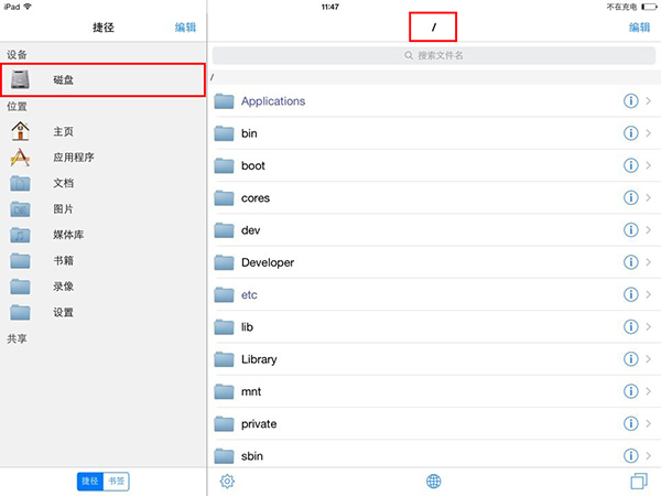 1、打開iFile文件管理器,選擇“磁盤”便會回到根目錄下【/】