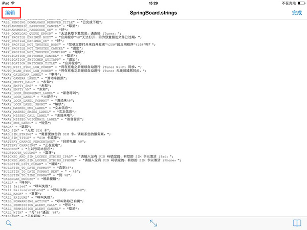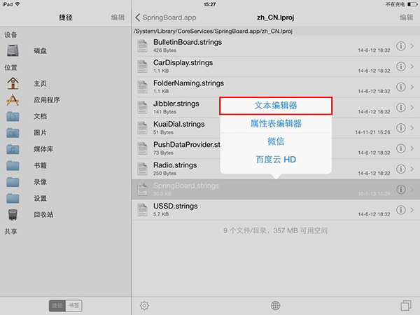 3、進入 zh_CN.lproj 文件夾後,找到 SpringBoard.strings 文件,點擊一下選擇“文本編輯器”