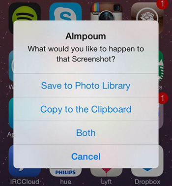 Almpoum是一款與截屏相關的Cyida插件,你可以設置截屏後執行的動作,共四個選項:彈出菜單選項、保存到相簿、復制到剪切板、保存到相簿同時復制到剪切板,還可以設置截屏反饋:開啟/關閉閃屏、開啟/關閉聲音等。