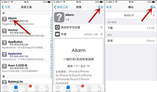 現在這款插件完美兼容了iOS8.4越獄系統,越獄後的小伙伴請在Cydia中添加源(apt.3kzhushou.com),之後你可以在源中找到“系統工具”—“Allarm”—點擊“安裝”,按照提示一步步完成,最後點擊“重啟SpringBoard”即可。