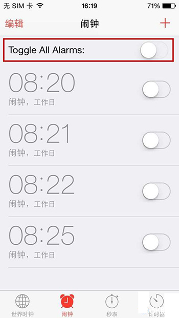 現在這款插件就安裝在你的手機裡了,打開鬧鐘就可以看到在鬧鐘列表的上方多了一個快速開關,打開或者關閉開關就可以快速選定所有的鬧鐘。