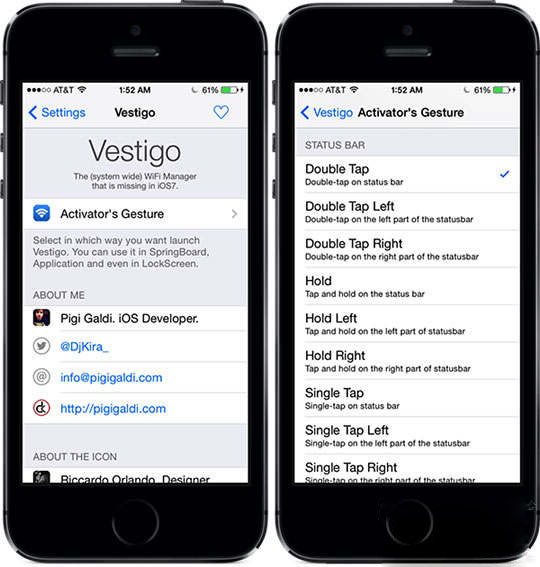 Vestigo可以讓你在任何位置任何頁面,通過activator手勢,快速從狀態欄呼出wifi管理菜單,你可快速查看周邊wifi信號並快速選擇你中意的信號,同時可以強制刷新wifi與查看每個wifi詳細信息(強度,加密方式,mac地址,AP模式等等)。