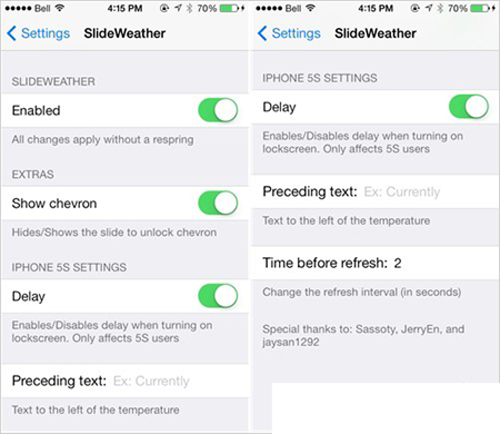 可以對插件進行啟用和停用,隱藏或展示滑動條,啟用或停用iPhone 5s鎖屏延遲。自定義文本,選擇間隔刷新(天氣信息就會隔一段時間進行刷新)。