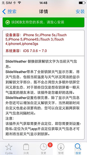PS:如果搜索不到SlideWeather ,可以進入Cydia—【變更】—點擊左上角【刷新】—再搜索該插件。