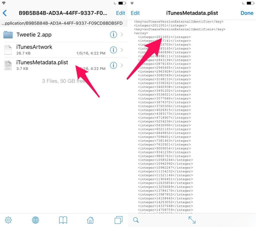 如果插件提供的已知版本還不夠“老”的話,你還可以找到該應用更老的版本號,並點擊右上角的加號即可。至於應用的版本號,可以通過iFile進入路徑/private/var/mobile/Containers/Bundle/Application/查看當中的 iTunesMetadata.plist。