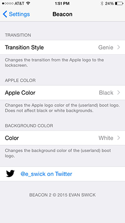 對於許多用戶來說,蘋果的開機界面早已十分熟悉了,一般來說開機動畫分為兩種,一種是黑色底白色LOGO,還有一種是白色底黑色LOGO,但是如果我們想要讓開機動畫變的更加有個性或者更加有趣一些,那就可能需要借助插件才可以實現了,今天小編就帶來一款可以更改開機畫面的插件《Beacon 2》,插件的設置非常簡單,只有三個選項供用戶進行選擇,不過已經可以滿足用戶的基本需求了,用戶可以對開機畫面的底色進行選擇,徹底告白非黑即白的底色,插件為用戶准備了紅色、藍色、綠色等不同的顏色,用戶可以根據個人喜好進行選擇,而對於蘋果的LOGO目前還是只有黑白兩色可供選擇。而對於進入到主界面時的動畫用戶也可以進行選擇,插件當中一樣為用戶准備了多種不同的方案。