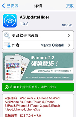 ASUpdateHider是一款iphone取消更新提示插件,當該軟件更新版本時,appstore會不斷的提醒您更新,如果您想取消該提示,但不想 更新,appstore是不允許的,ASUpdateHider正是未解決該煩惱而開發,安裝後可以為您的appstore更新頁面app更新列表增加滑 動隱藏更新功能,原生ui開發, 深度集成,體驗非常棒。