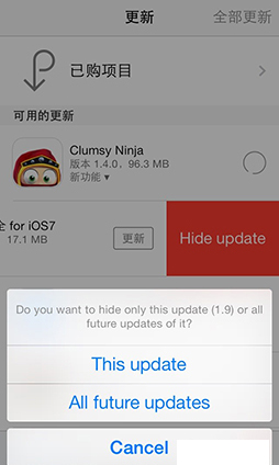 1.隱藏app時可選隱藏改app所有更新或當前版本更新。