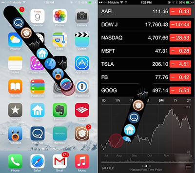 安裝這款插件後,只需在屏幕上點擊和拖拽按鈕覆蓋圓點AppButton就可以顯示最近使用過的應用,然後在你想要打開的應用上釋放手指便可切換到該應用。你可以往任何的方向進行拉拽,並移動手指即可,並確保手指不要抬起離開屏幕。
