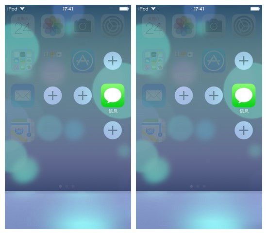 插件的運行效果可以參看視頻,對著你想要設置為“封面”的應用圖標滑動一下,將能出現一個呈“十”字狀排列的布局,如果正好在邊線上,布局也會稍微改變。