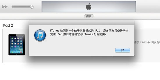 1、 當iPad進入恢復模式了,iTunes會彈出下方窗口,選擇【好】。