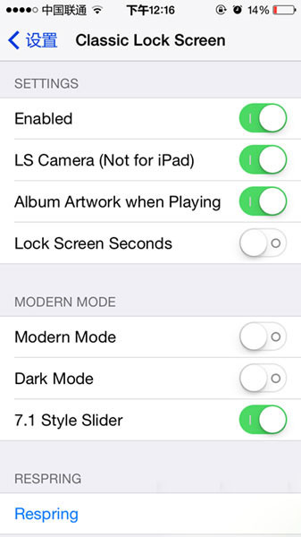 iOS7的鎖屏風格很好看?但iOS6的也很經典,那麼該如何取捨?能不能將他們混在一起?ClassicLockScreen告訴你是可以做到的。它也可以幫助你將iOS7鎖屏界面替換為iOS6樣式。這款插件為你提供了4款鎖屏的樣式。分別是經典模式,現代模式,深色模式,和7.1滑動條風格(和 iOS 7.1.x 關機界面的滑動條風格類似)。安裝這款插件後,經典模式是默認的風格。