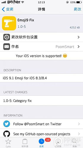 需要注意的是,Emoji9 Fix這個插件的說明中只提到了適用於iOS8.3和iOS8.4系統,其他系統請勿使用。iOS7.0到iOS8.2系統用戶可以搜索emoji9 legacy[beta]這個插件。當然,iOS9.0用戶也可以嘗試一下,但是有什麼後果就不知道了。
