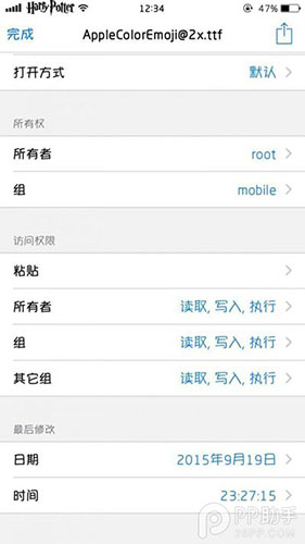 - 用filza或者iFile進入字體文件夾查看表情字體的權限,路徑是/System/Library/Fonts/core,如上圖所示。