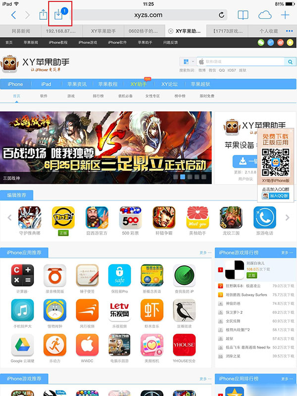 3:安裝以後,打開safari,就可以在上方操作欄看到有下載按鈕啦。(iphone是在底部)