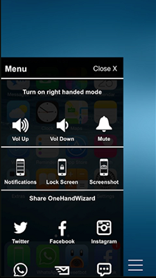 在屏幕底部還有一個按鍵,點擊這個按鍵可調出更多功能,這些一般都是需要雙手操作的功能(除非你的大拇指夠大夠長),它包含的功能包括:調整音量、靜音、訪問通知中心、回到鎖屏、截圖,還有就是與好友共享OneHandWizard。