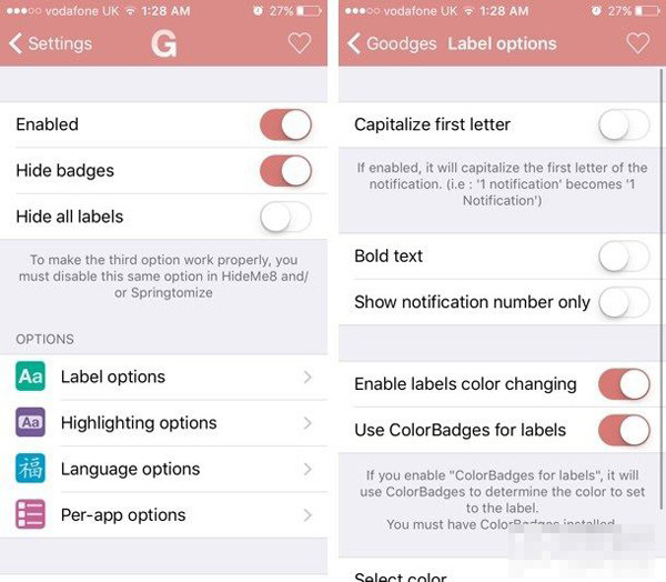 這款插件還提供了多個自定義選項可選,用戶可以對應用標簽(顯示通知的地方)的外觀顏色進行修改,加粗字體或者讓首字母大寫等。如果你對這款插件感興趣,不妨到Cydia免費下載。