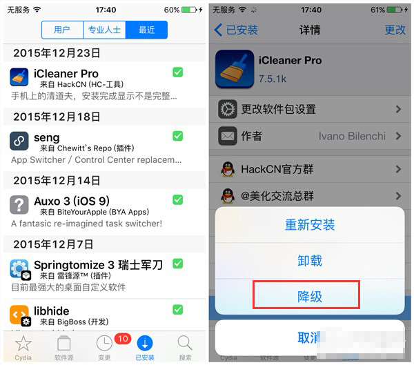 4、在Cydia的已安裝選項中找到iCleaner Pro插件,然後點擊右上角【更改】,選擇降級至7.4.4版本。