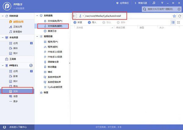 2、設備連接PP助手電腦版,在【文件-文件系統(越獄)】中找到路徑【/var/root/Media/Cydia/AutoInstall】,導入已下載的iCleaner Pro文件,然後重啟設備。