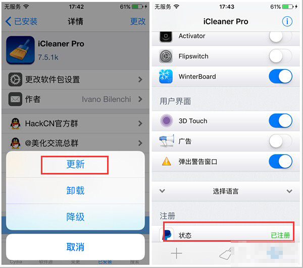 5、繼續在Cydia中找到iCleaner Pro插件,點擊右上角【更改】,選擇更新。