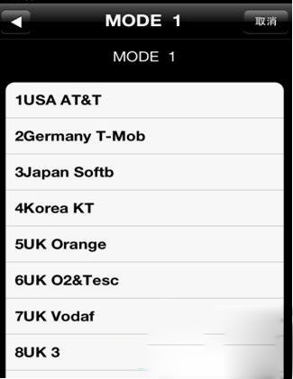 2:點擊“ Country&operators” 選擇本機鎖機運營商。被選擇的會顯示在iPhone手機屏幕上端標題欄。(例:MODE 1就代表第一個 MODE AT&T,如果手機是AT&T有鎖機,那就可以跳過此步驟,直接進入下一步),如果在“Country&operators”菜單列表內沒有要選擇的運營商,可以在“Edit code”內輸入MCC MNC用來解鎖你的手機,比如你是日本au版,你可以點Edit code輸入:44054,這樣,你就自己編輯進去了AU的運營商,之後你操作的時候直接選擇編輯好的運營商進行解鎖操作就可以了。