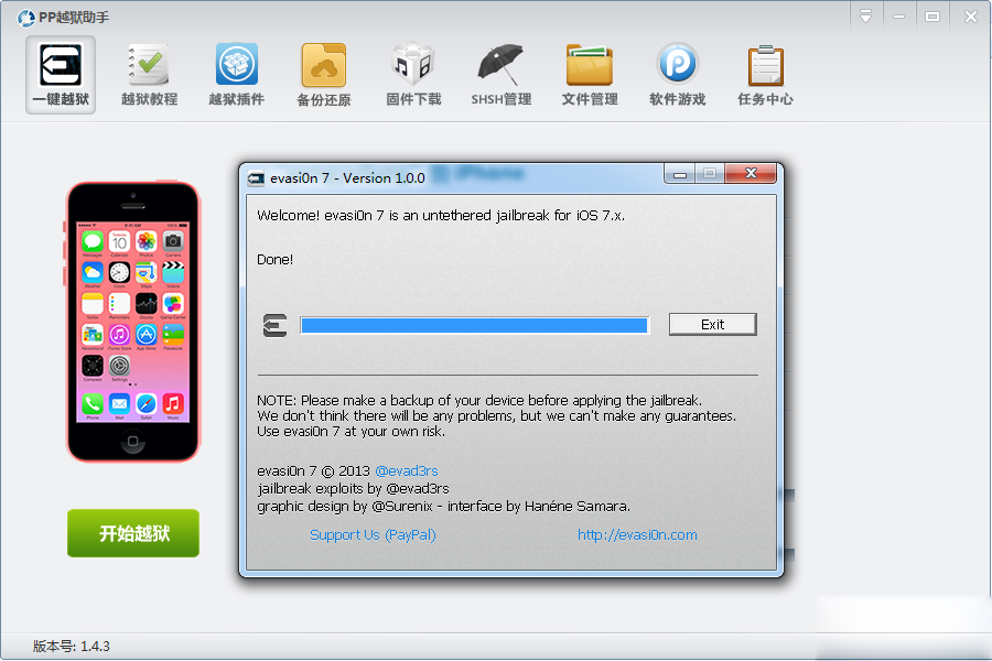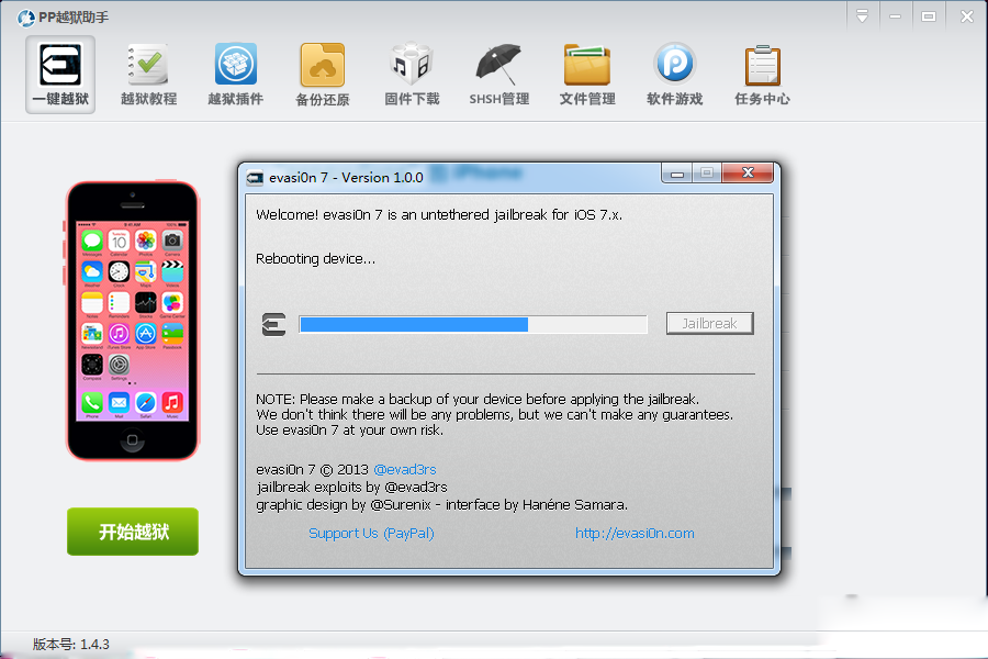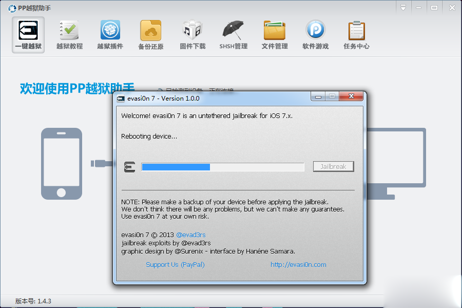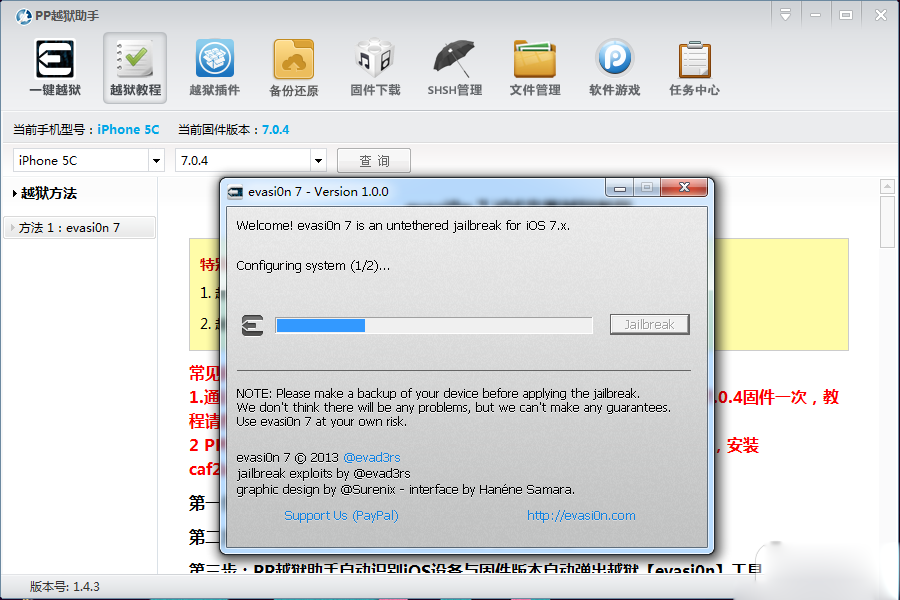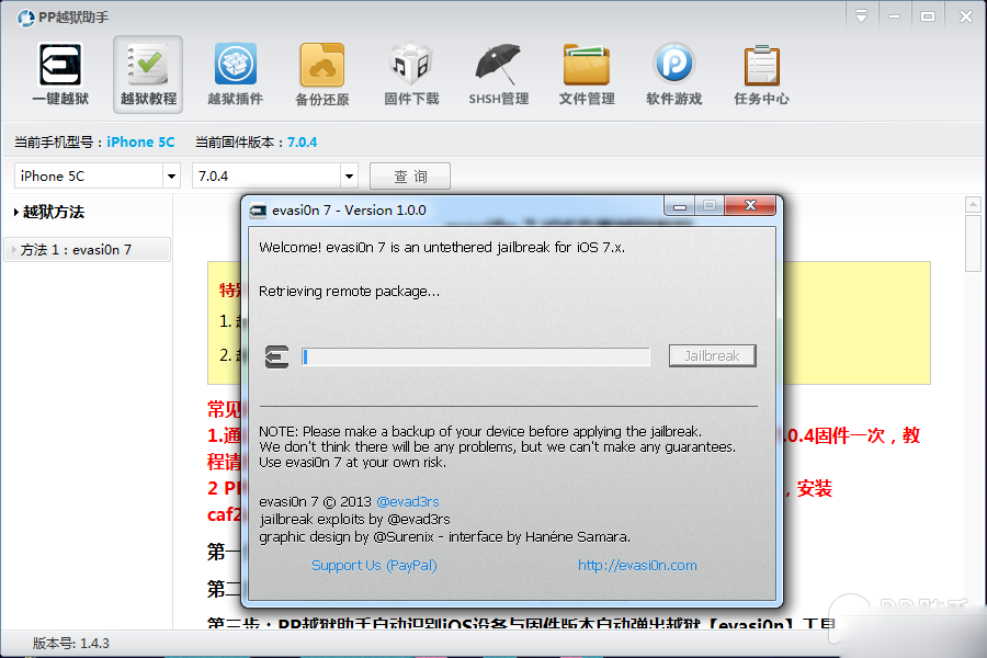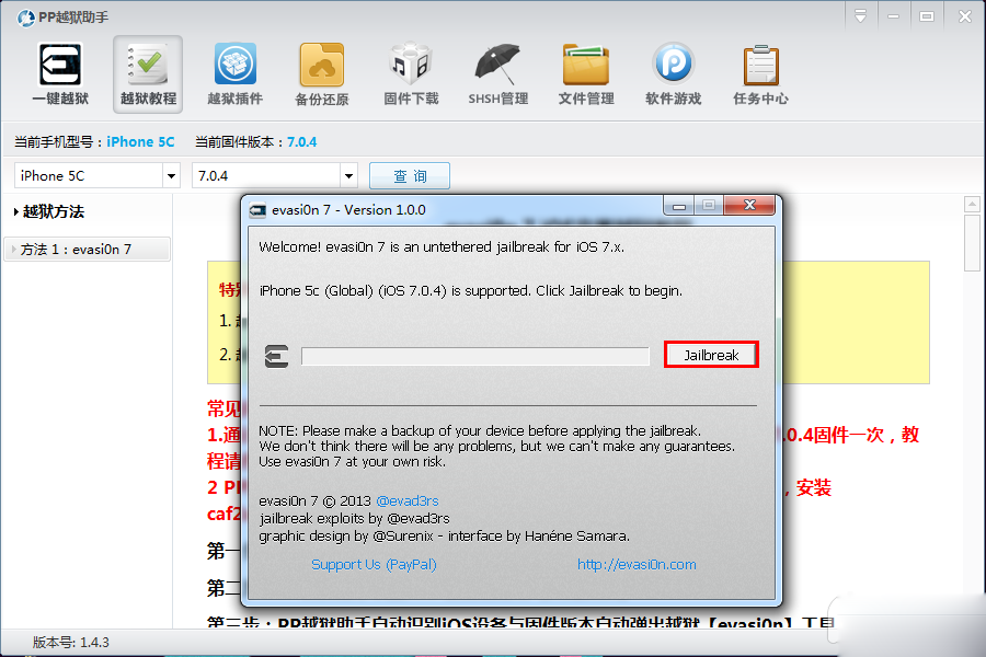 3:PP越獄助手自動識別iOS設備與固件版本自動彈出越獄【evasi0n7】工具。
