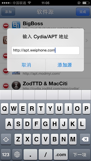4:在彈出的輸入框裡輸入apt.weiphone.com 輸完點擊添加源,在跳出來的軟件源警告窗口選擇 仍然添加。