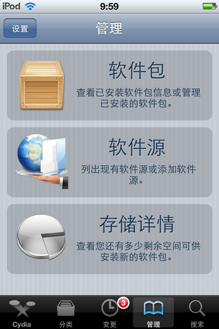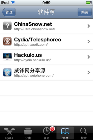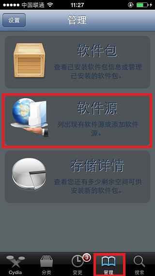 2:進入Cydia之後,點擊下方的“管理”。