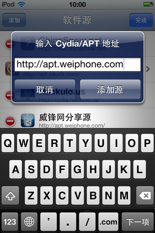 4:進入“編輯”頁面之後,點擊添加,之後輸入威鋒源:apt.weiphone.com。