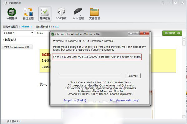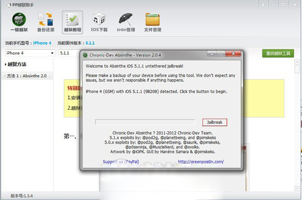 2:Absinthe2.0.4自動識別設備的固件版本及型號後點擊【Jailbreakme】按鈕。