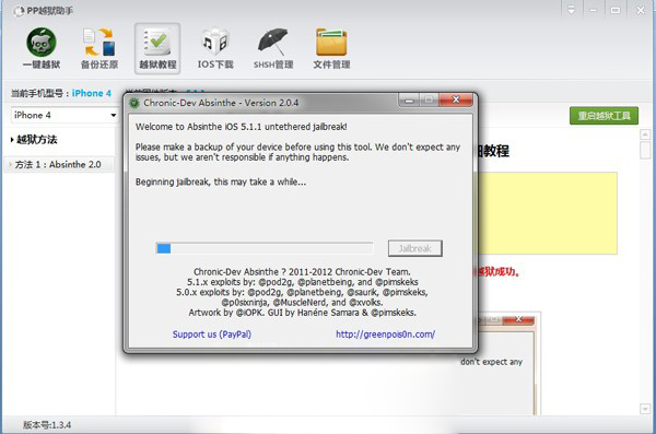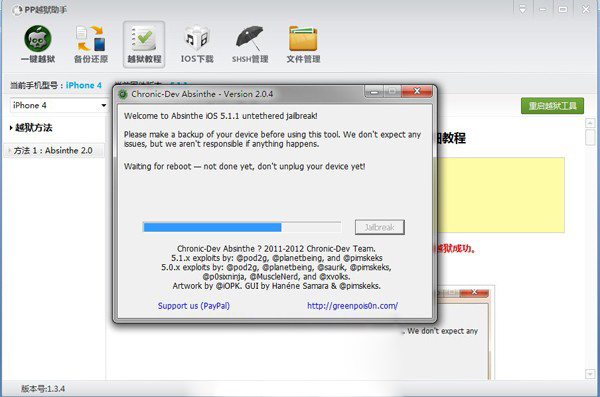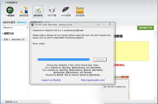 3:Absinthe2.0.4自動開始越獄,如已完成越獄,軟件即提示:Done,enjoy!