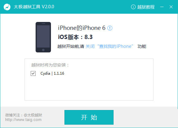 3.越獄工具自動識別後,如下圖所示,會提醒您關閉“查找我的iPhone”功能,如果你確認已關閉,可忽視該提示文字。點擊按鈕【開始】。