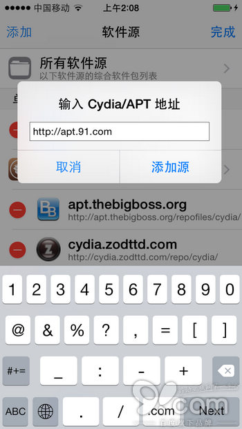打開Cydia,依次點擊【軟件源】—>【編輯】—>【添加】—>輸入源地址http://apt.91.com—>點擊【添加源】→等待數據自動加載更新→點擊【回到Cydia】