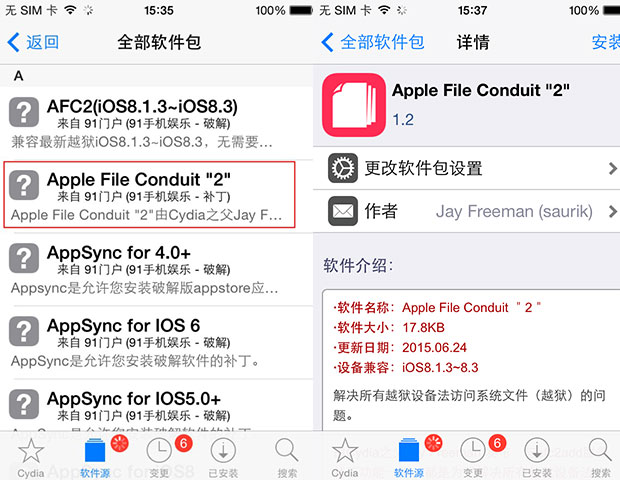①添加91源安裝afc2add補丁(即Apple File Conduit “2”)