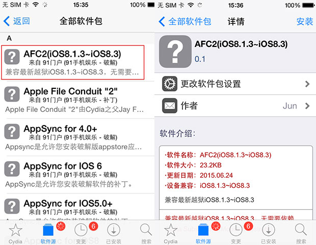 直接進入91源內安裝AFC2(iOS8.1.3~iOS8.3)補丁,具體操作步驟:點擊進入91源中找到【AFC2(iOS8.1.3~iOS8.3)】,點擊右上角的【安裝】按鈕,再點擊右上角【確認】,Cydia就會自動安裝好AFC2(iOS8.1.3~iOS8.3)補丁,安裝好後,請務必重啟下設備使其生效。