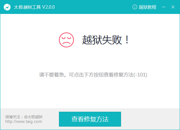 3、如果越獄失敗,請先檢查越獄工作准備及前提條件是否已完成,如屏幕鎖定設定為永不鎖定,取消鎖屏密碼,關閉查找我的iPhone,若以上前提條件已完成,請點擊越獄工具上的“查看修復方法”。