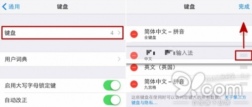 挑你最常用的鍵盤,拖放到最上面,再點“完成”,以後它就默認出現在第一位啦。隨便打開一個需要打字的應用都會首先顯示這個默認鍵盤噢!
