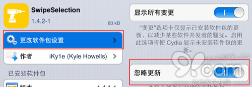 打開Cydia,找到忽略更新的插件,更改軟件包設置–>忽略更新。好了,角標也消失了。