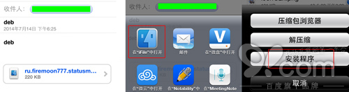 方法2:如果已經安裝iFile,則可以用iFile安裝。將deb傳到設備,比如發個郵件給自己。在郵件中點擊附件,選擇用iFile打開,點擊“安裝程序”,然後Respring。