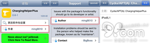 在Cydia插件安裝頁,我們可以找到作者信息,點擊可以進入插件支持頁面,點擊作者即可向作者發送包含安裝基本信息的報錯郵件,附件是Cydia操作記錄和你設備中的插件列表。你可以在郵件正文描述出錯的情況。