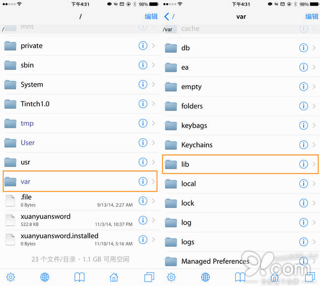 第一步:在 iOS 設備上用 iFile (在 PC 上用91助手等工具)打開 iOS 設備的根目錄,進入 /var/lib/cydia 這個文件夾,找到 metadata.plist。