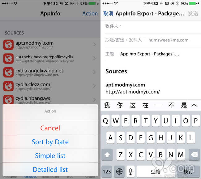 備份插件列表要用到 AppInfo 這款插件,它本身就有顯示源和插件列表的功能,通過它可以直接把你設備上的源和列表做成一個列表通過 Mail 分享出去,所謂的備份插件列表就是把這封 Mail 發給自己。